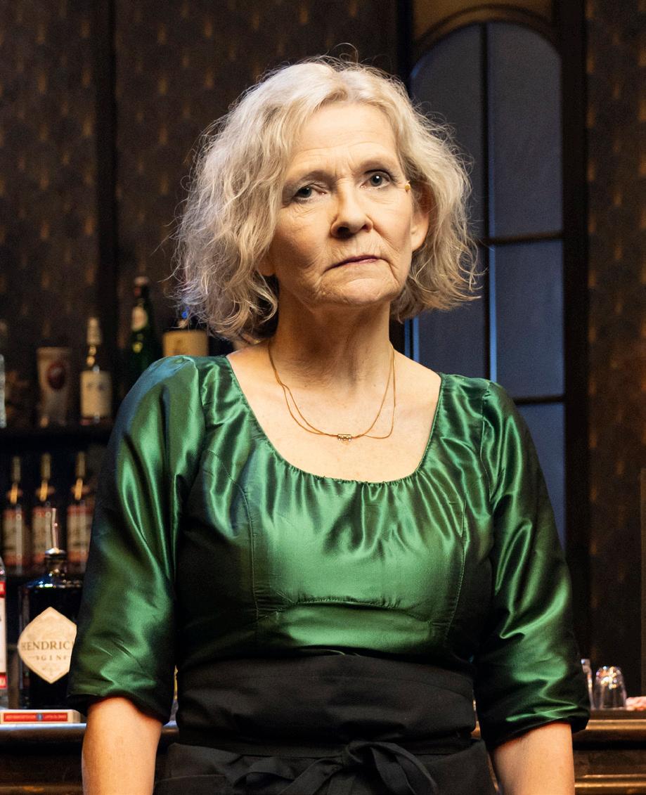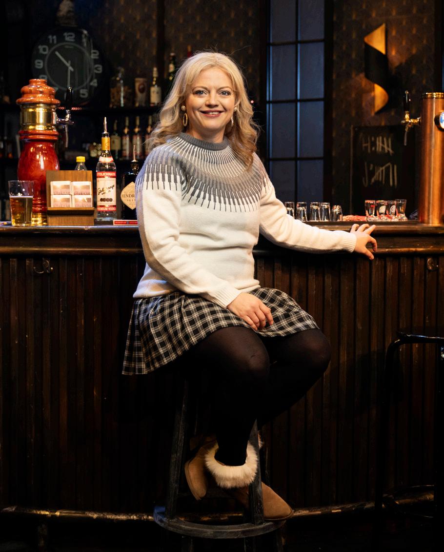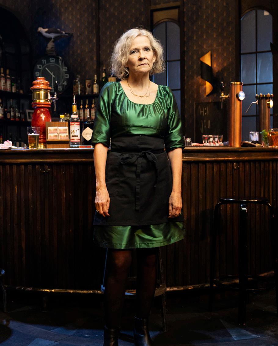 Ingrid forteller at hele opplegget med turistene handler om bærekraft. At de utnytter alle ressursene. Hele baren dreier rundt på scenen mens hun forteller.