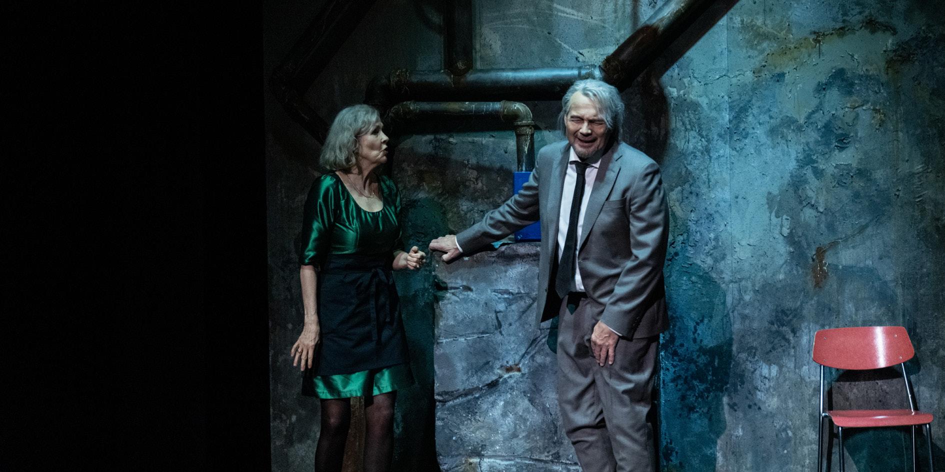 Kjellerrommet lyses opp. Da er det mørkt på resten av scenen, og bare dette rommet til venstre vises.