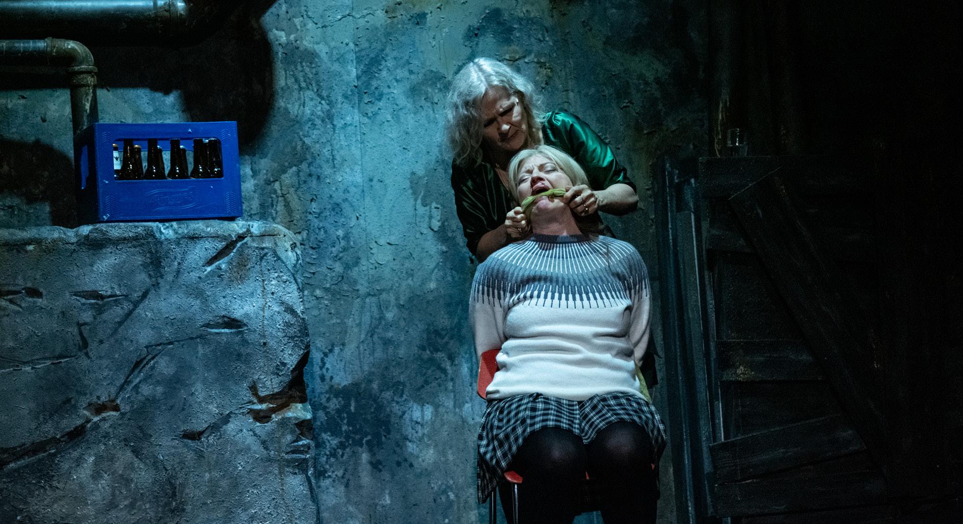 Samtidig ser vi Liv som sitter fastbundet i kjelleren med blod under nesa. Hun roper.