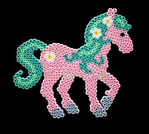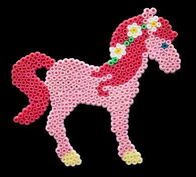 Inhalt: Ca. 3.000 Perlen, 4 kleine Stiftplatten: Herz Nr. 236-05, Pony Nr. 321-07, Blume Nr. 327-48 und Prinzessin Nr. 328. Motiv-Vorlage, Anleitung und Bügelpapier.