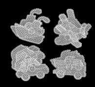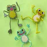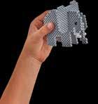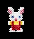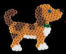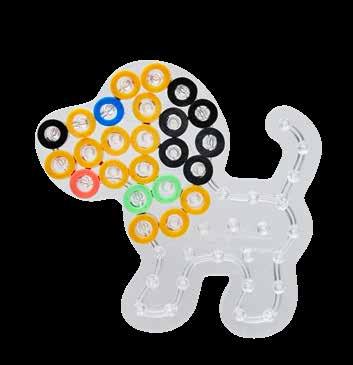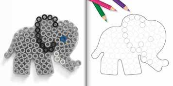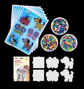 Inhalt: Ca. 3.000 Perlen, 4 Stiftplatten: Kleine sechseckige Nr. 223-03, kleiner Elefant Nr. 319-09, Papagei Nr. 320-05 und kleiner Hund Nr. 326. Motiv-Vorlage, Anleitung und Bügelpapier.