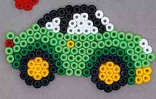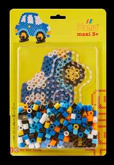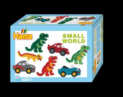 Inhalt: Ca. 2.000 Perlen, 2 Stiftplatten: Auto Nr. 311 und Dinosaurier Nr. 322. Motiv-Vorlage, Anleitung und Bügelpapier.