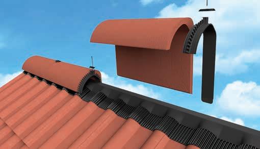 A universal ventilated dry fix ridge and hip system that can be fitted with no special tools required. The patented jointing gasket adds flexibility and is also trimmable. System is suitable for different roof pitches. BS8612 compliant. Patent Pending No. GB2402727.8