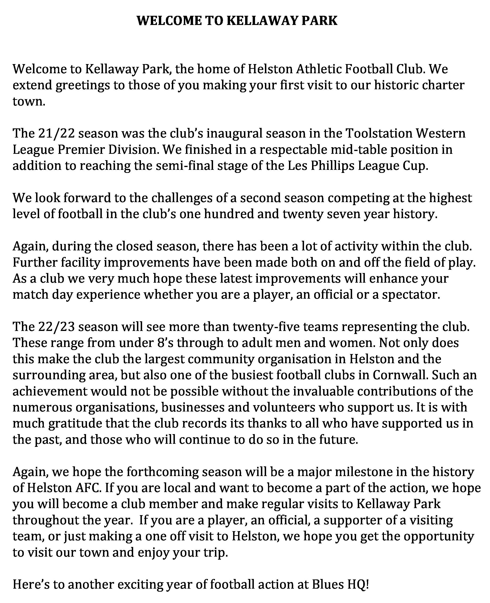 With this evening being the final home fixture may I sign off with a huge thank you to everyone whose has represented and / or supported the club this season. A special mention to all sponsors and advertisers along with those who give up their time to ensure Helston Athletic Football Club is now recognised both as major trophy winners and a club at the heart of its community.