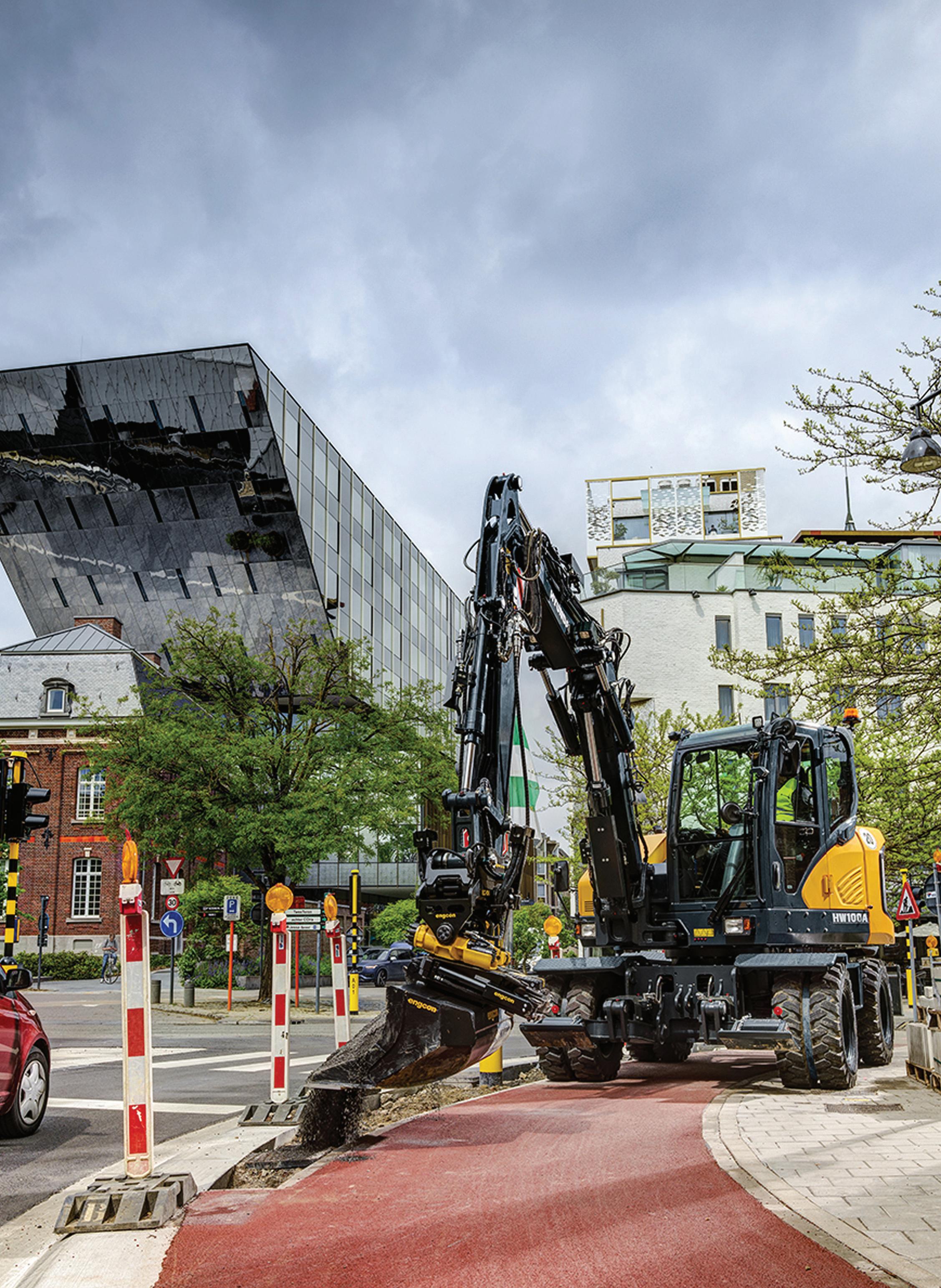With a slim counterweight and a tailswing radius of just 1,600mm, the HW100A can work within a single carriageway. The machine is equipped with three steering modes, increasing manoeuvrability in confined site conditions. Twowheel steering uses the front wheels only to turn and is designed for maximum stability when travelling at speed.