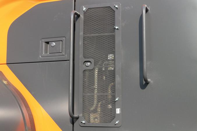 crossing bar over the window and a reversing radar with sonor and visual indicators in the cab. With the orange seat belt, it can easily be identified to ensure safety when driving the machinery. A red beacon is installed on the roof with automatic pop-up display and alerts on the harmony dashboard to ensure protocols are followed. Pedestrian and obstacle detection is also an option within 2.5 metres of the machine.