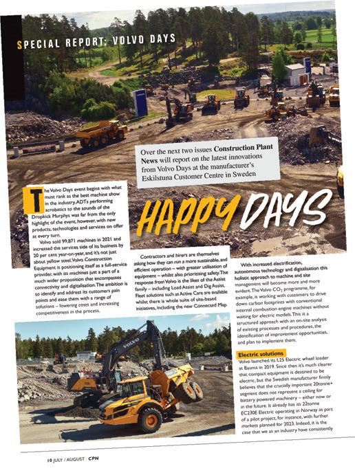 C ONTENTS JULY / AUGUST 2023 THIS ISSUE... @CPN_mag cpnonline.co.uk Construction Plant News, Regal House, Regal Way, Watford, Herts, WD24 4YF. cpn@hamerville.co.uk e 10 REGULARS 5 EDITOR’S VIEWPOINT 6 NEWS 18 CPN AT LARGE 26 MACHINES IN ACTION 28 FLEET ADDITIONS 30 TECHNOLOGY CORNER 32 NEWPRODUCTS CPN I JULY / AUGUST 3 FEATURES PLANTWORX 15 Plantworx review – the machine highlights from the Peterborough showground. COVER STORY 20 JCB’s 403E isn’t afraid of a hard day’s work. COMPACTS & MINIS 22 CPN rounds up current machine models that might be on your shopping list. 13 22 20 15 SPECIAL REPORTS 10 Industry in Site. It’s electric versus diesel – who comes out top? IDTechEx points to the winner. 13 Polishing up those skills. Flannery Plant plugs the skills gap with its bootcamp.