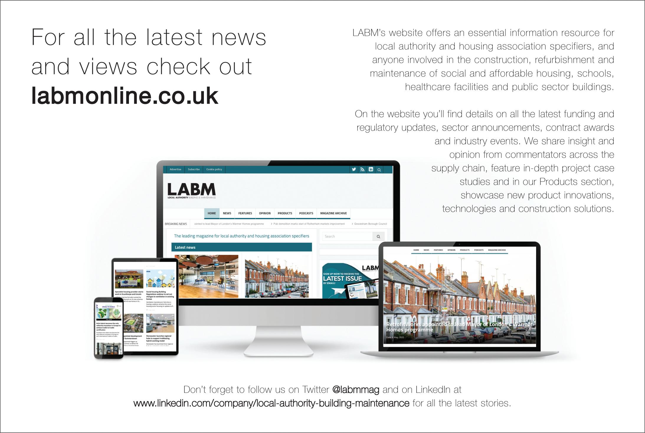 n More information on AKW’s Onyx Care Pod here www.rdr.link/lag034 5 0 I L A B M N O V E M B E R / D E C E M B E R 2 0 2 2 Advertisement index Here is a useful summary of all the adverts that appear in this issue of Local Authority Building & Maintenance. Each is listed with its page number and a direct URL that will get you straight to the relevant online information A Proctor Group (page 11) www rdr link/LAG100 Aico ..............................................(page 37) www rdr link/LAG101 BMI UK & Ireland (page 2/IFC) www rdr link/LAG102 Crown Commercial Service ........(page 9) www rdr link/LAG103 Designer Contracts (page 4) www rdr link/LAG104 Dulux Trade ..................................(page 19) www rdr link/LAG105