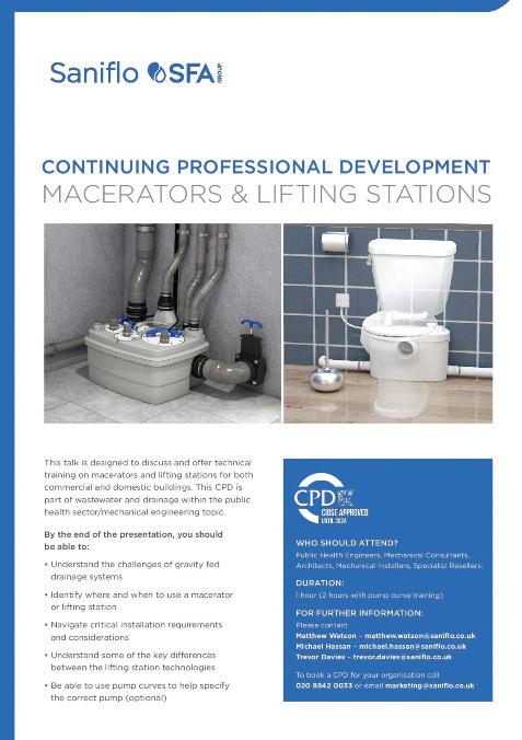 Saniflo provides a new CPD offering Saniflo UK has a new CIBSE approved CPD offering for Public Health Engineers, Mechanical Consultants, Architects, and Mechanical Installers The hour long talk, which can be supplemented with a two hour session of pump curve training if required, is designed to discuss and offer technical training on macerators and lifting stations for commercial and domestic buildings This CPD is part of wastewater and drainage in the public health sector/mechanical engineering