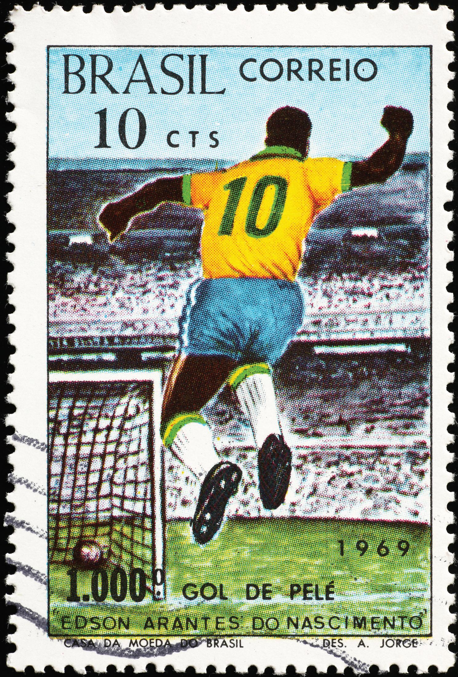 A Brazilian stamp marking a celebration of the thousandth goal scored by Pelé