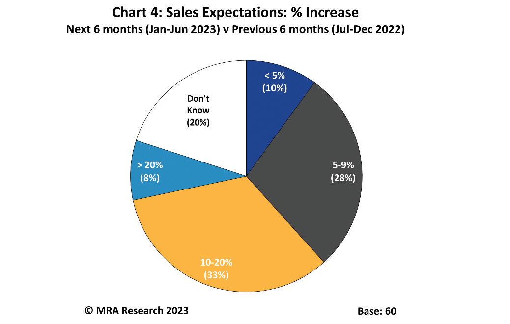 One in ten (10%) merchants expecting higher sales in the next six months expected to increase by less than 5% Chart 4 However, just over a quarter (28%) expected an increase of 5 to 9% and a third (33%) expected growth of 10% to 20% A further 8% were expecting growth of more than 20%