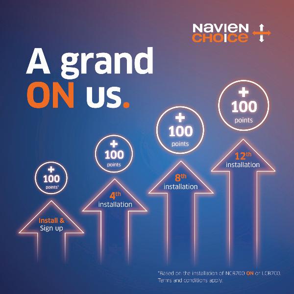 Navien is offering new and existing members of its recently relaunched loyalty programme the opportunity to gain even more points this autumn Indeed, installers who are new to Navien Choice Plus the latest evolution of its Navien Choice loyalty programme will receive additional points on its range of gas- or oilpowered boilers, following their first installation registered with the platform In addition to the rewards installers already receive through the programme ’ s tiered system of silver, gold, platinum and diamond, both new and existing members will be able to claim up to 100 more points for every four boilers they install Points accrued through the programme can be exchanged for amazing rewards including cameras, smart watches, coffee machines, DeWalt toolkits and even holidays or cash (platinum and diamond members only)