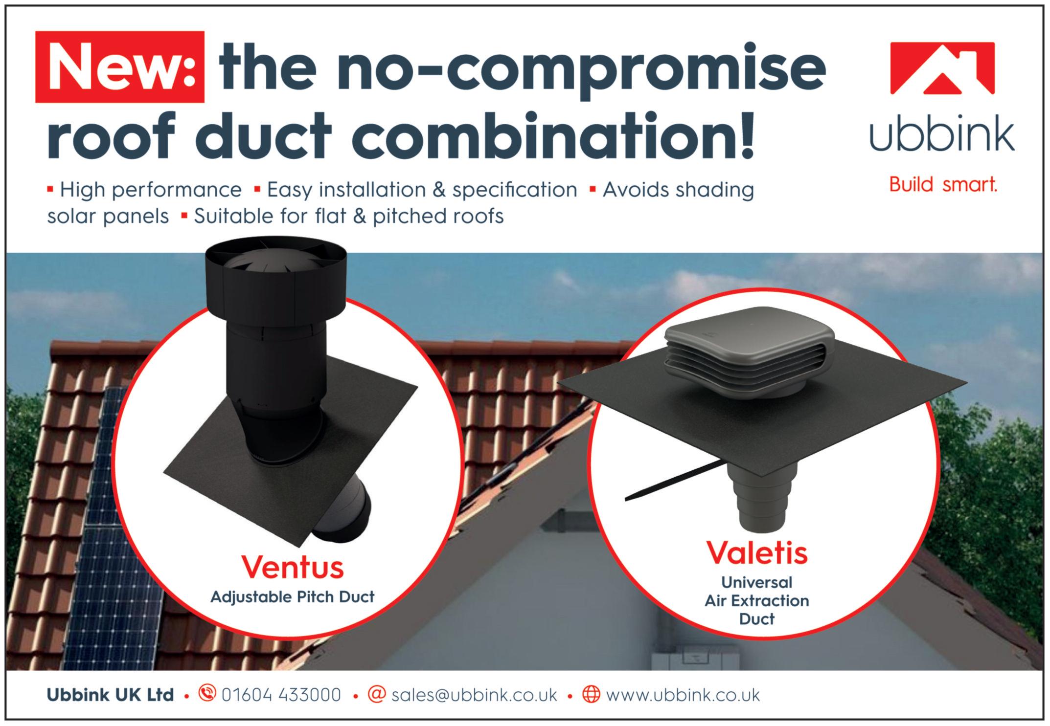 Ubbink’s two all-new terminals are said to o outstanding performance with increased mechanical ventilation efficiency. The Ventus insulated roof duct, for example, is designed for both air supply and extraction, on flat or pitched roofs and it can be easily adjusted for pitched roofs between 15° and 55°.