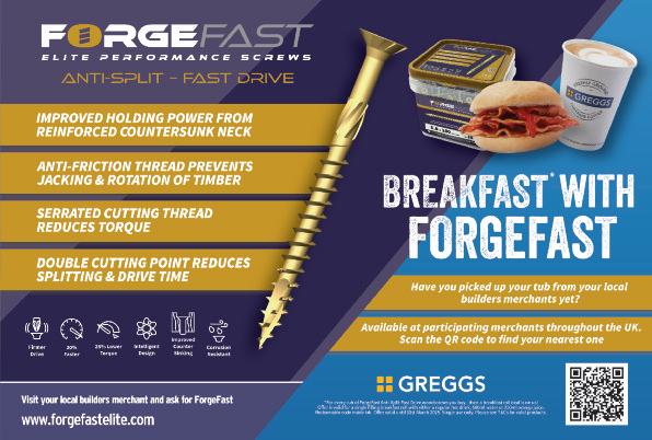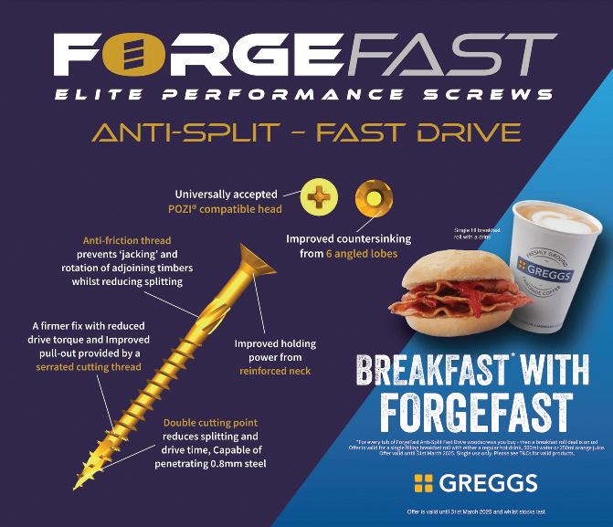 As discussed in detail earlier in this issue PBM, ForgeFix is marking the launch of its rebranded and expanded range of ForgeFast “elite performance screws ” with a special promotion that will allow customers to get a free breakfast at Greggs