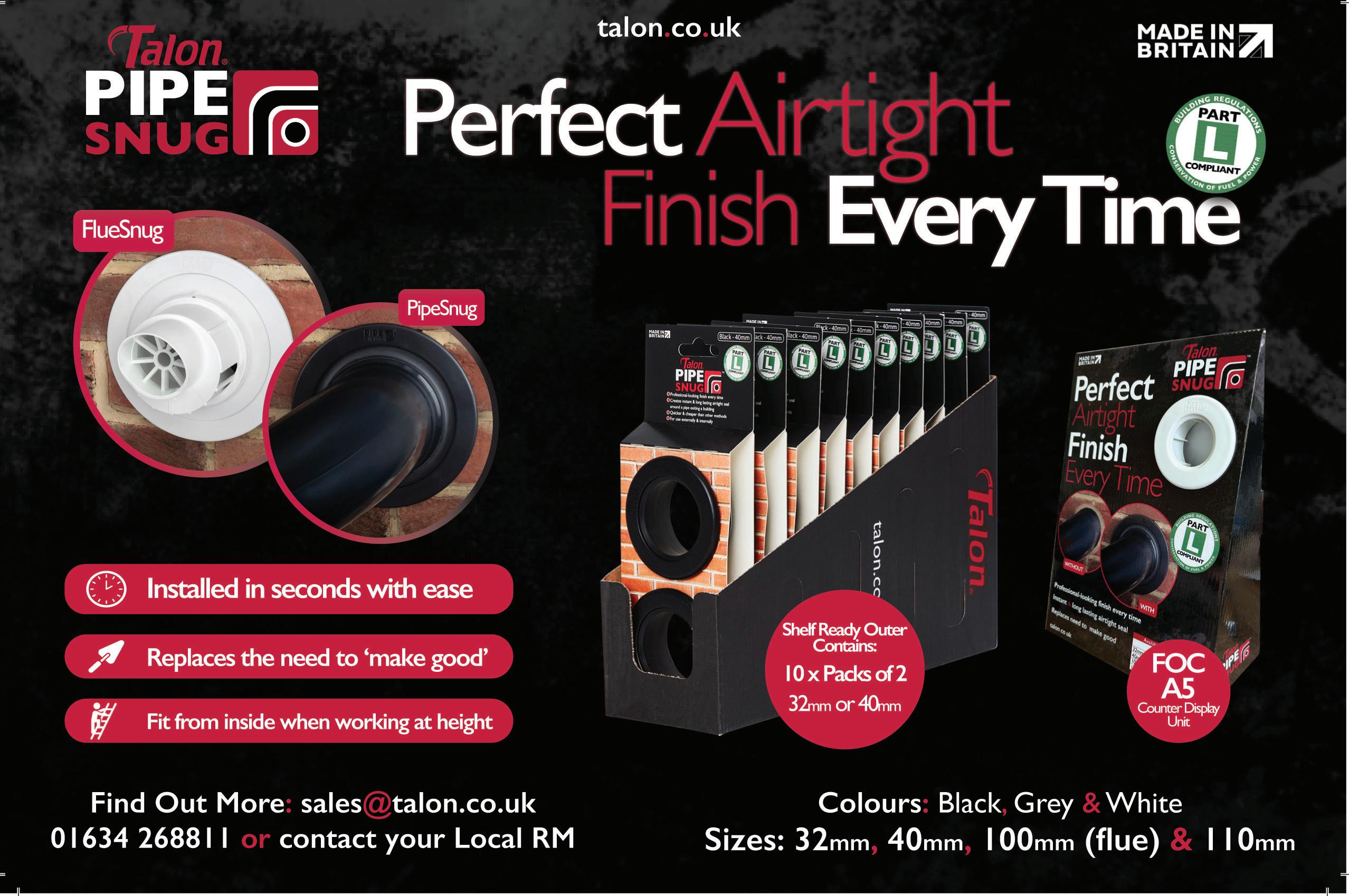 Also featured is FlueSnug, which replaces the traditional method of using mortar or plaster to seal around boiler flues Approved by leading boiler manufacturers, the product fits all 100mm flues, is designed to create an airtight seal both internally and externally and is flexible enough to be pushed through the installation opening from the inside, so there is no need to install at height