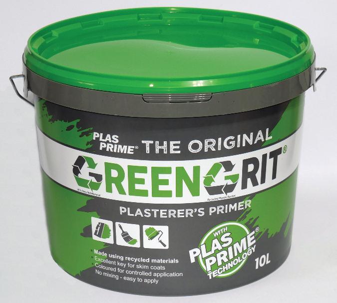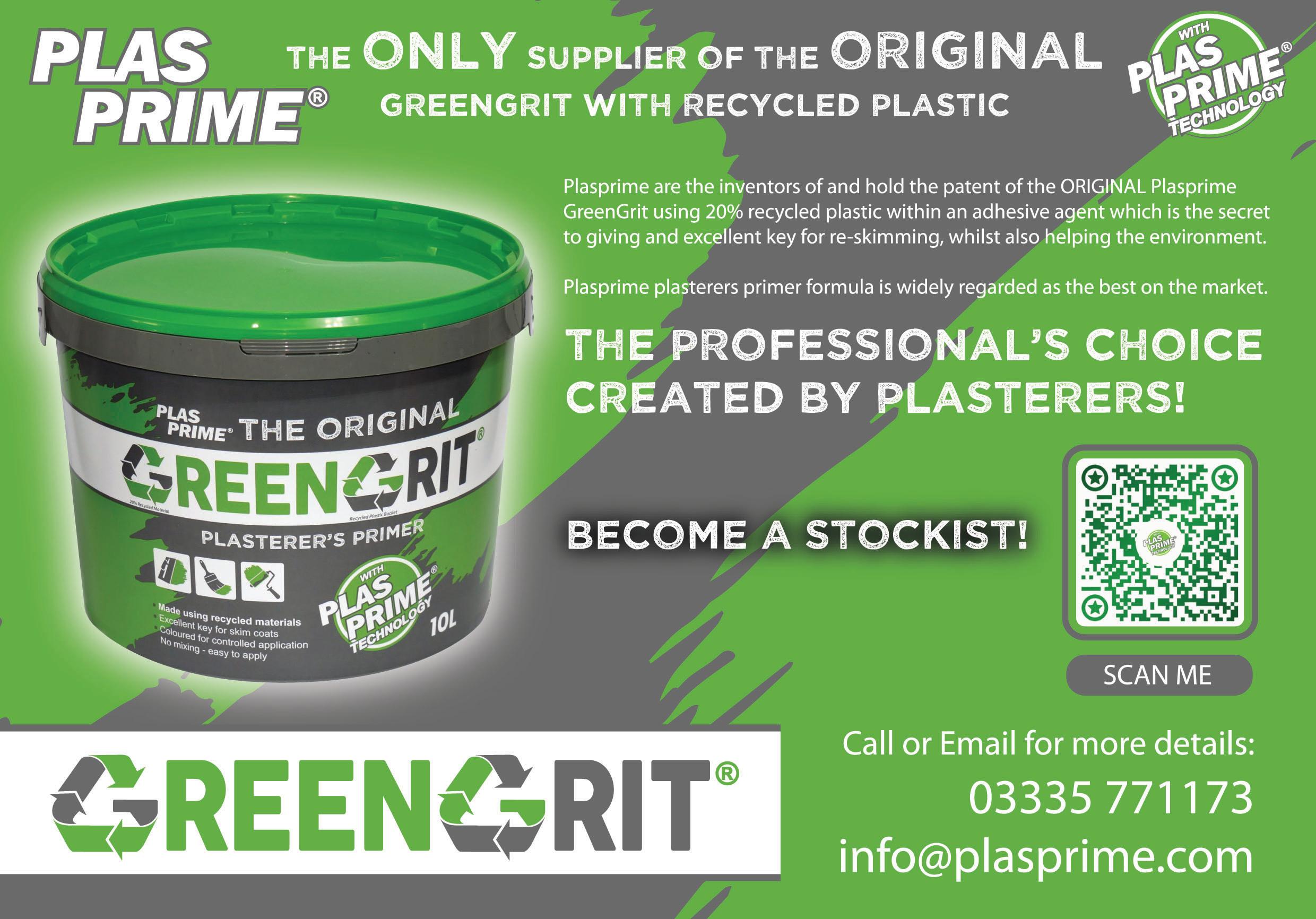 Previously marketed under licence originally as S overieign PLASPRIME The Green Primer, followed by C ementone Plasterers Stabilising Primer with PlasPrime Technolog y and latterly as B ostik C ementone Plasterers Stabilising Primer with Plasprime Technolog y Plasprime has confirmed that it will now “concentrate solely on manufacture and distribution ourselves” for its popular ‘Green Grit’ specialist primer, specifically designed for the professional plasterer