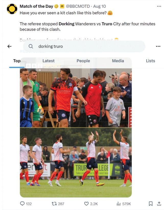 The resolution? Dorking retur ned to the field wearing their shirts inside out Judging by the pictures from the Match of the Day feed on X ( @ B B C M O T D ), I’m not too sure this was much better