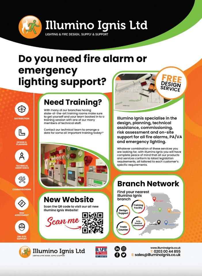 Lighting and fire design specialist, Illumino Ignis, is using its latest advertising campaign to highlight the benefits of the brand’s fire alarm and emergency lighting support services. The striking advertising artwork nicely breaks down the Illumino Ignis offering, which includes a free design service that provides planning and technical assistance to contractors, along with specialised training that is delivered by members of Illumino Ignis’ technical staff and held in the company’s state-of-the-art training rooms.