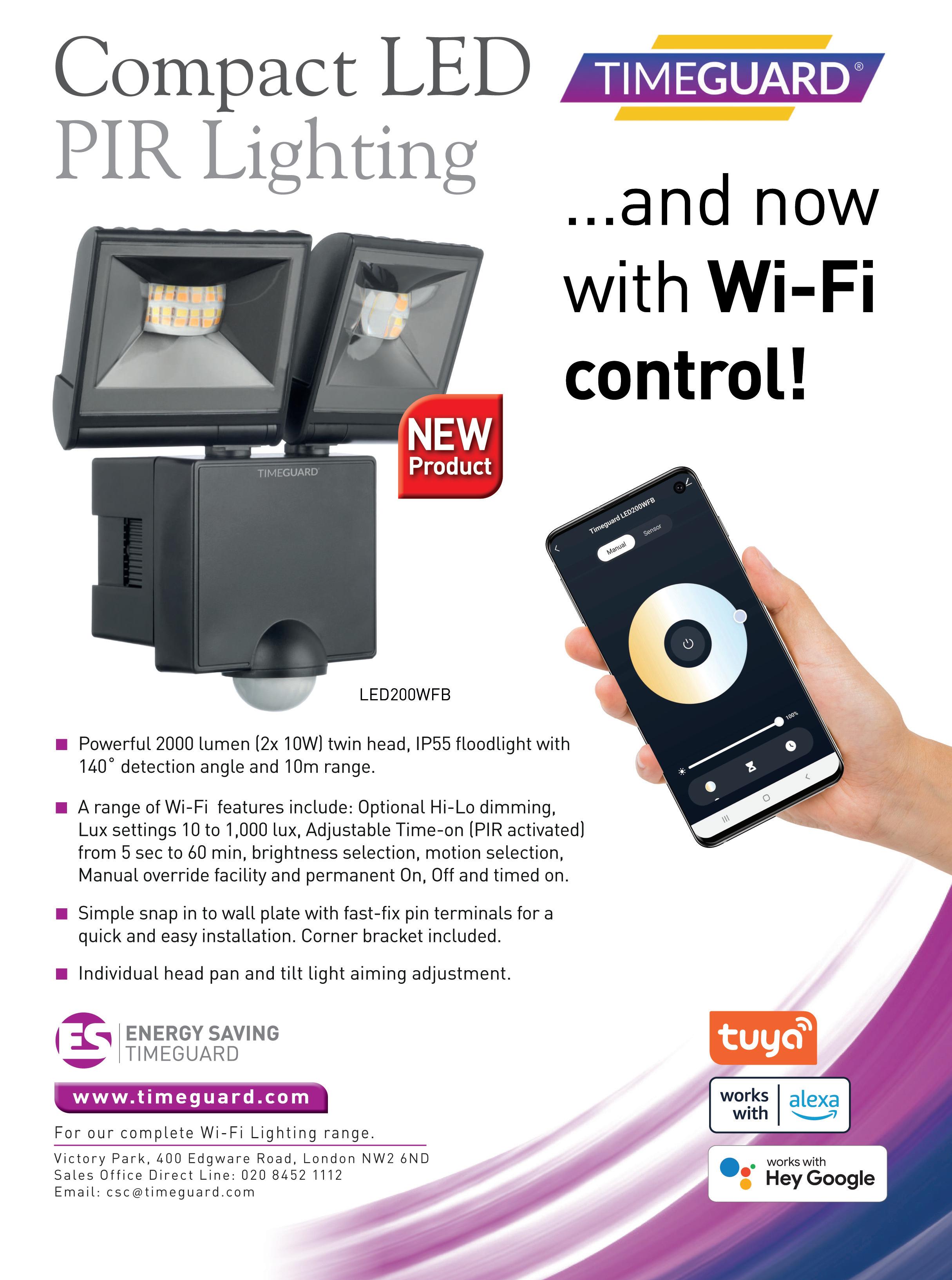 If you want to offer customers smart control of their outdoor lighting without replacing their existing units, take a look at Timeguard’s new WiFi PIR sensors. Controlled via the popular TuYa App, these PIR controllers can be programmed to operate at precise times or dusk to dawn. With a detection range of 12m, ‘On’ times from 30 secs to 30 mins and rating for up to 250W of LED lighting, these stylish PIRs will cover most individual’s needs. They’ll even continue to operate as programmed if the WiFi signal is lost. The Timeguard WFPIR detectors are offered in black or white polycarbonate, with quick-fit terminal blocks and wall fixing accessories (rawl plugs and screws) supplied for back or bottom cable entry.