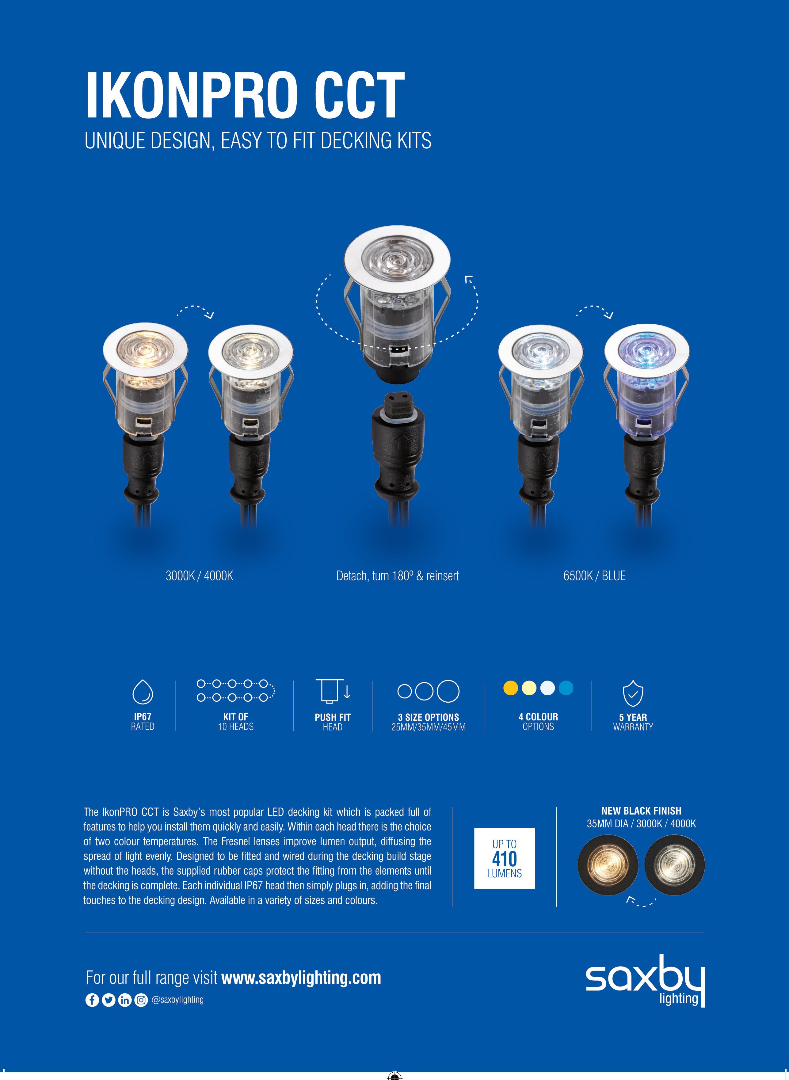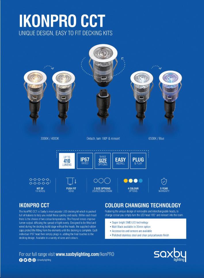 Arriving as the nights start to get lighter and the weather warms up, Saxby Lighting’s latest advertising campaign showcases the IkonPRO CCT – a uniquely designed range of easy to fit decking kits. The campaign artwork highlights all of the features and benefits of the range, which boasts Colour Change Technology, four colour options, super bright SMD LED technology, a push fit head along with three different size options. The range offers everything you need to help your customers to ‘stack the deck’.