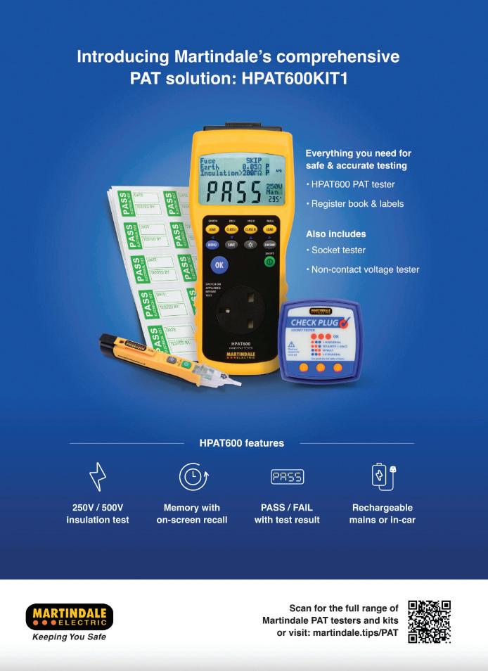 Martindale Electric continues to build its portfolio of products with the launch of a comprehensive PAT solution – the HPAT600KIT1. The main focus of Martindale’s latest campaign of adverts, the kit offers everything installers need for safe and accurate testing, including the HPAT600 PAT tester, register book and labels, socket tester and noncontact voltage tester. The visually catching artwork also includes a wealth of extra features that come with the HPAT600.