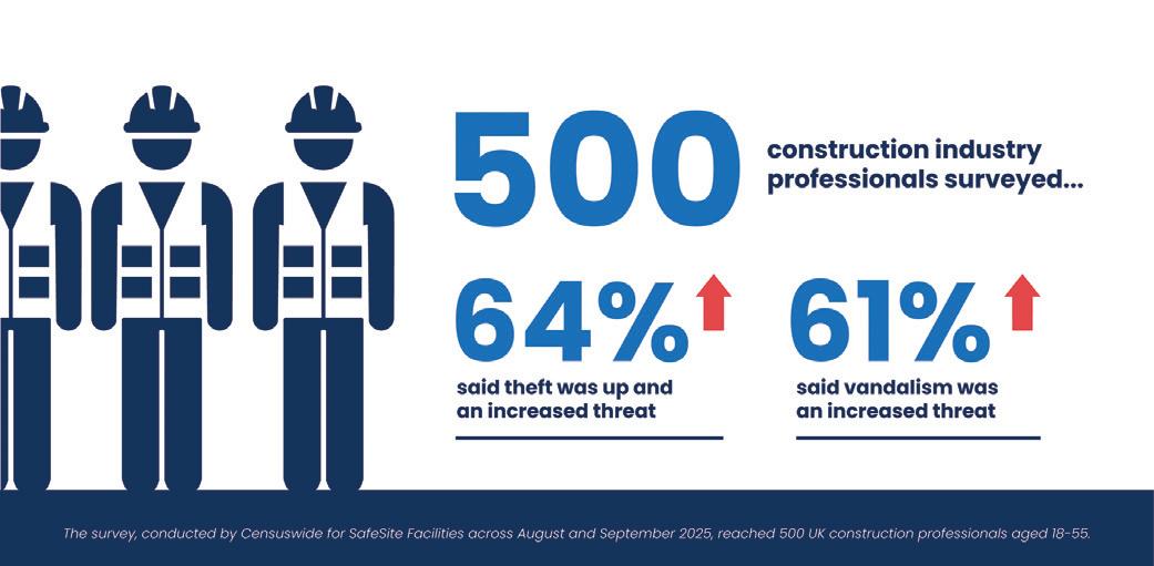 This comes from a survey of 500 construction industry professionals, comissioned by SafeSite Facilities. 64% of respondents said theft was on the up and 61% said vandalism was an increased threat. In addition, 56% of management said they were worried about the issue.
