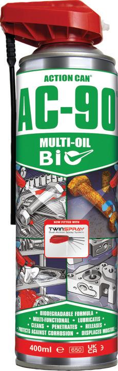 Action Can’s AC-90 BIO introduces a biodegradable multifunctional oil within the company’s Green Force product family The product features a 63% bio-based carbon content (ASTM-D6866-22) and meets OECD 301B (>60%) biodegradability criteria, delivering strong performance with reduced environmental impact AC-90 BIO displaces moisture, lubricates moving components, penetrates and releases seized fasteners, and protects metal parts against corrosion It contains no silicone and leaves a fine protective film to support long-term smooth operation The TwinSpray 2-in-1 system, with 360° spray capability, enables precise application, even in inverted positions