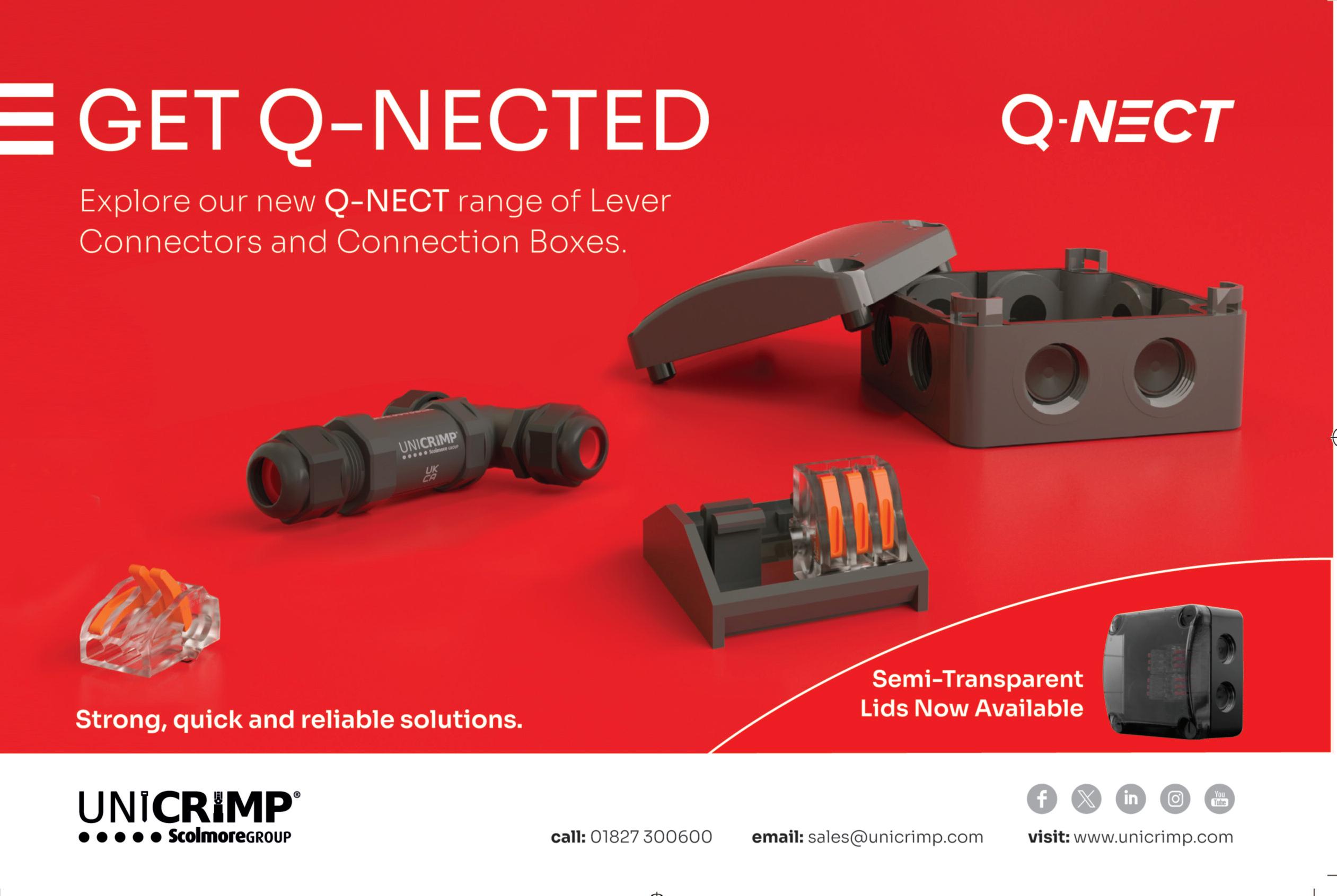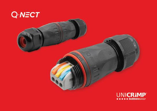 Unicrimp has strengthened its weatherproof cable accessory offering with the introduction of the Q-Nect IP68 Inline Connector Engineered for secure, durable electrical terminations in demanding conditions, it provides long-term resistance to water, dust and environmental ingress, making it ideal for challenging commercial, industrial and outdoor installations Rated IP68, the connector offers robust protection supported by two 3-port lever connectors for quick, reliable termination Dual PG16 cable glands ensure strong sealing and cable retention, while adjustable cable entry points support varied installation requirements The terminal accommodates solid conductors from 0 08 - 4 mm² and stranded conductors from 0 082 5 mm², providing flexibility for a wide range of applications Whether powering outdoor lighting, pumps or equipment, the unit delivers dependable performance and confidence, even when exposed to the elements The connector joins Unicrimp’s growing portfolio of professional cable accessories