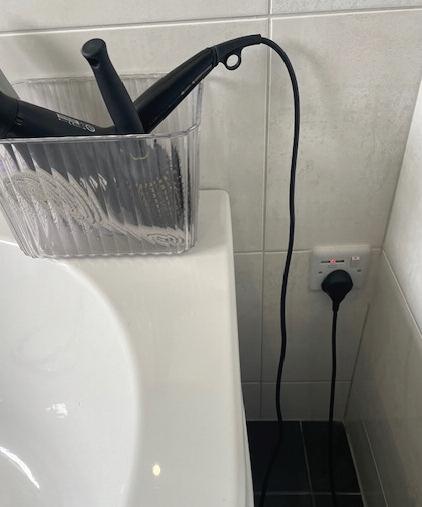 RICHARD HODGKINSON: WE FOUND THIS WHILE WORKING ON A RENTAL PROPERTY, AND IT WASN’T THE LAST TIME I WORKED THERE! THE TENANT SAID THAT IT WAS FITTED BY A PROFESSIONAL, AND THAT THEY DIDN’T USE THE BATH THE HAIRDRYER CORD WAS LONG ENOUGH TO REACH INTO THE SHOWER CUBICLE ON THE OTHER SIDE OF THE BATHROOM (IN USE), THOUGH THEY HAD USED A 20 MM GROMMET IN THE BACK BOX AND CPC SLEEVING WE PROMPTLY DISCONNECTED FROM THE ADJACENT SOCKET IN THE BEDROOM AND BLANKED IT OFF BEFORE INFORMING THE LANDLORD, WHO HAD NO KNOWLEDGE OF IT