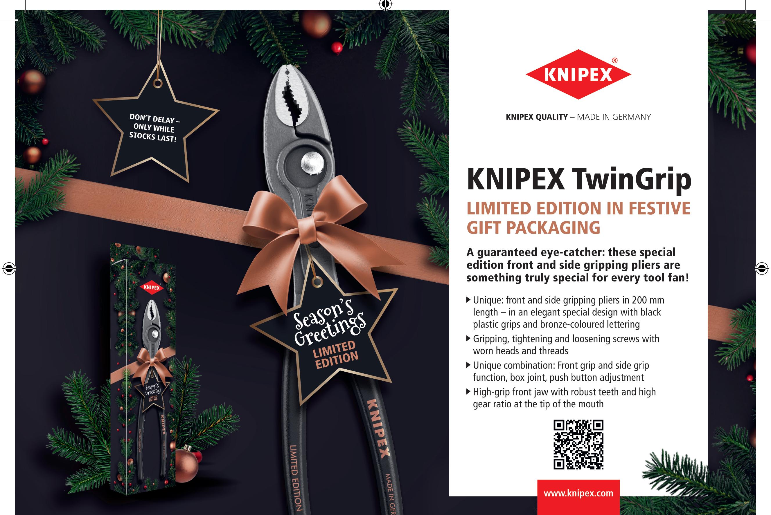 KNIPEX brings festive flair to the toolbox with its new limited-edition 200 mm TwinGrip (82 01 200 S02), combining premium engineering with standout visual appeal. Produced as a limited edition, this collector’s model features a sleek grey atramentised finish, slim black grips and elegant bronze-toned lettering Each pair arrives in custom Christmas packaging, making it an ideal seasonal gift for trade professionals and enthusiasts The TwinGrip is designed to excel where other pliers struggle Front and side gripping jaws ensure dependable hold on worn, rusted or rounded screws, while a five-position push-button slip joint provides a wide gripping range from 4 - 22 mm A robust box joint increases stability and working life, complemented by built-in pinch-stop protection and a narrow head profile for tight-access applications Versatile, tough and engineered for precision, this limited edition TwinGrip is a standout addition to any toolkit – but stock is limited, so early purchase is recommended