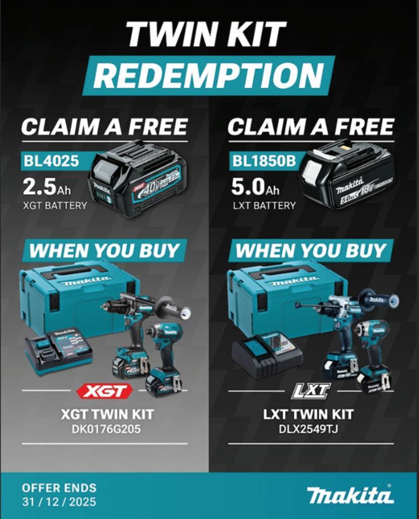 Customers can claim a free XGT 2 5 Ah battery (BL4025) when purchasing a DK0176G205 XGT Twin Kit, and a free LXT 5.0 Ah battery (BL1850B) when buying a DLX2549TJ LXT Twin Kit