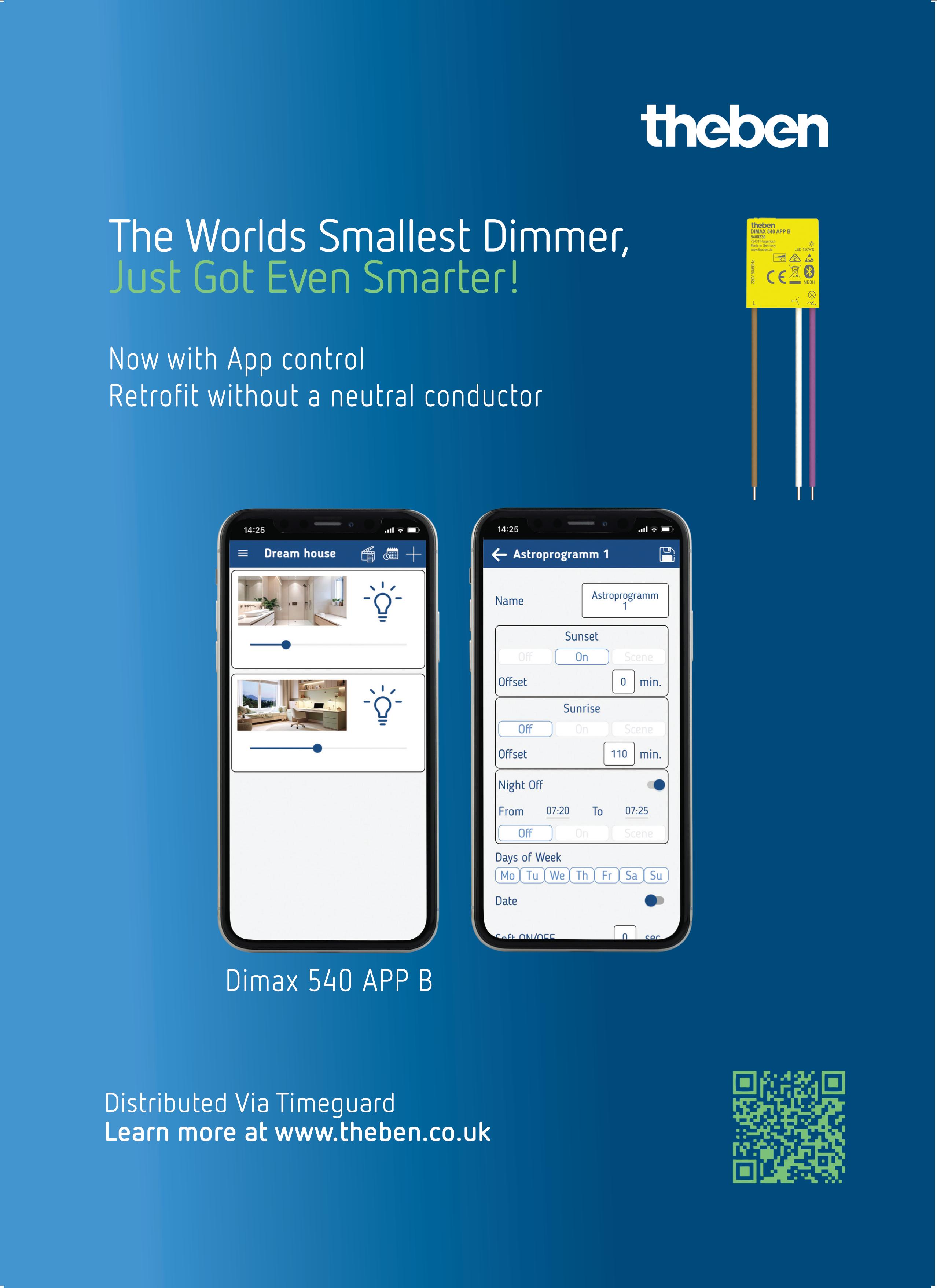 Smart lighting control in older buildings can be challenging, especially where space is limited or no neutral conductor is available. Theben’s DIMAX 540 APP B mini dimmer solves this by bringing modern, App-based control to existing installations without altering cabling or chasing walls At just 32 5 × 26 6 × 9 6 mm, it remains one of the smallest smart dimmers on the market A key upgrade is Bluetooth Mesh Multiple DIMAX 540 APP B units can communicate across the property, providing extended range and strong reliability If one device fails to respond, another seamlessly relays the signal For retrofit projects, this enables robust smart control without WiFi or a central hub Setup is handled via the App or a standard push button, allowing installers to configure groups and scenes for bathrooms, kitchens, or open-plan areas. Users benefit from preset moods for dining, working, or relaxing. The new astro function adds automatic switching based on sunrise and sunset, ideal for outdoor lighting, shopfronts or interior schedules The unit retains the core features of the original DIMAX 540 plus B, including smooth 0 - 100% dimming, extended five-second dimming for fine adjustment, minimum brightness settings, and protection against overcurrent, overheating and short circuits It supports LEDs, halogens and incandescent lamps, works without a neutral conductor, fits behind a standard switch, and handles cable runs up to 100 metres For installers seeking a compact, reliable and future-ready retrofit solution, the DIMAX 540 APP B brings modern control to the buildings that need it most.