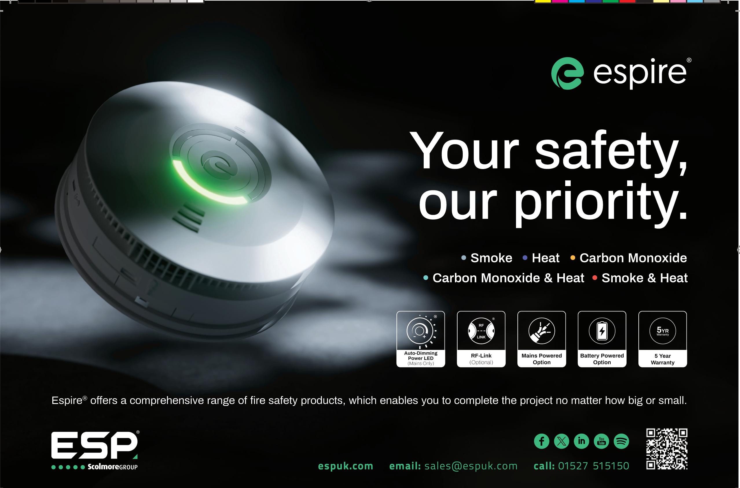 ESP’s Espire Alarm Finder helps homeowners, landlords and businesses identify the correct smoke, heat and Carbon Monoxide alarms for their property. By answering a short set of guided questions, users receive tailored product recommendations and clear advice on alarm placement to support compliance and maximise safety The tool first determines the property’s location – England, Wales, Scotland, Northern Ireland or Ireland – to apply the correct regional standards It then covers key details such as property type, size, required system grade, monitored risks, power options and features including RF-Link interconnection and a Remote-Control Switch RF-Link allows alarms to communicate for improved protection, while the controller enables easy testing in line with BS 5839-6:2019 Users can request personalised documentation for their installation ESP’s Espire range includes Grade D1, D2 and F1 alarms, offering smoke, heat, CO and combined units with features such as auto-dimming LEDs, insect mesh, 24-hour memory, RF link and lock-in bases