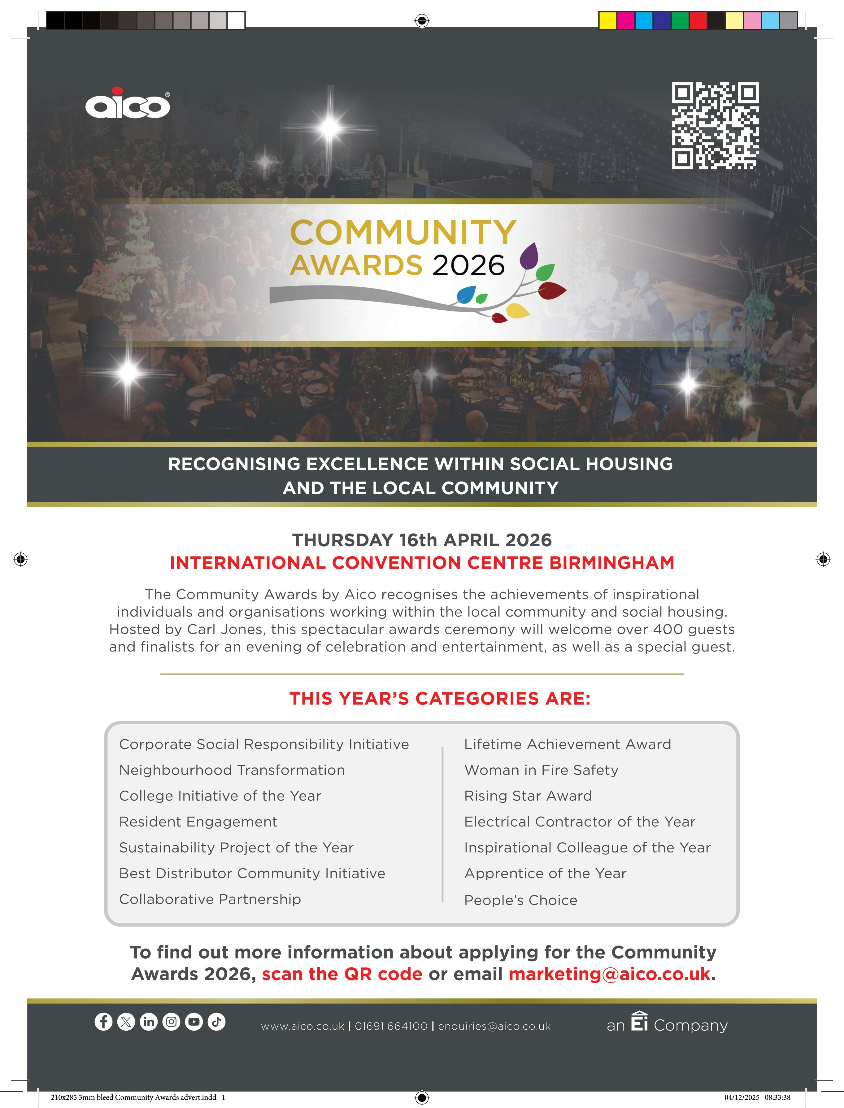 Aico is bringing back its biennial Community Awards this coming year, with the event set to take place at The International Convention Centre in Birmingham on 16th April. The event celebrates excellence and inspirational achievements from across the UK housing industry, honouring those