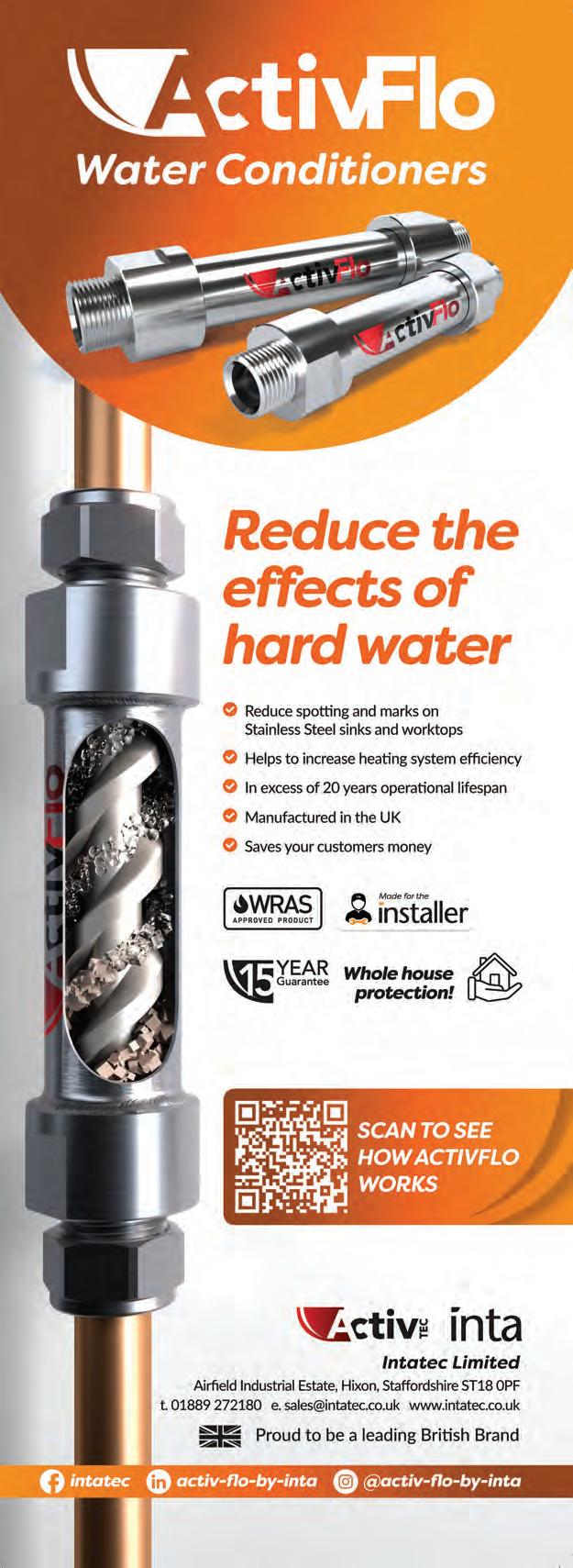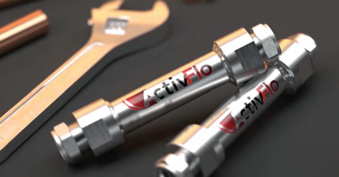 durable and corrosion resistant. It’s a fit-and-forget design, which makes it low-maintenance and gives you long-term peace of mind. The life expectancy is over 20 years and it comes with a 15-year warranty.” ActivFlo comes in a variety of sizes and while considering which version to keep in the van, Chirag notes: “The ActivFlo comes in both a 15mm and 22mm option, but if you want to keep one as van stock, I’d recommend having the 22mm one with the 15mm reducing set, so that if you go to a job and you want to upsell to your customer the benefits, you know that you’ve got one that will fit anywhere.”