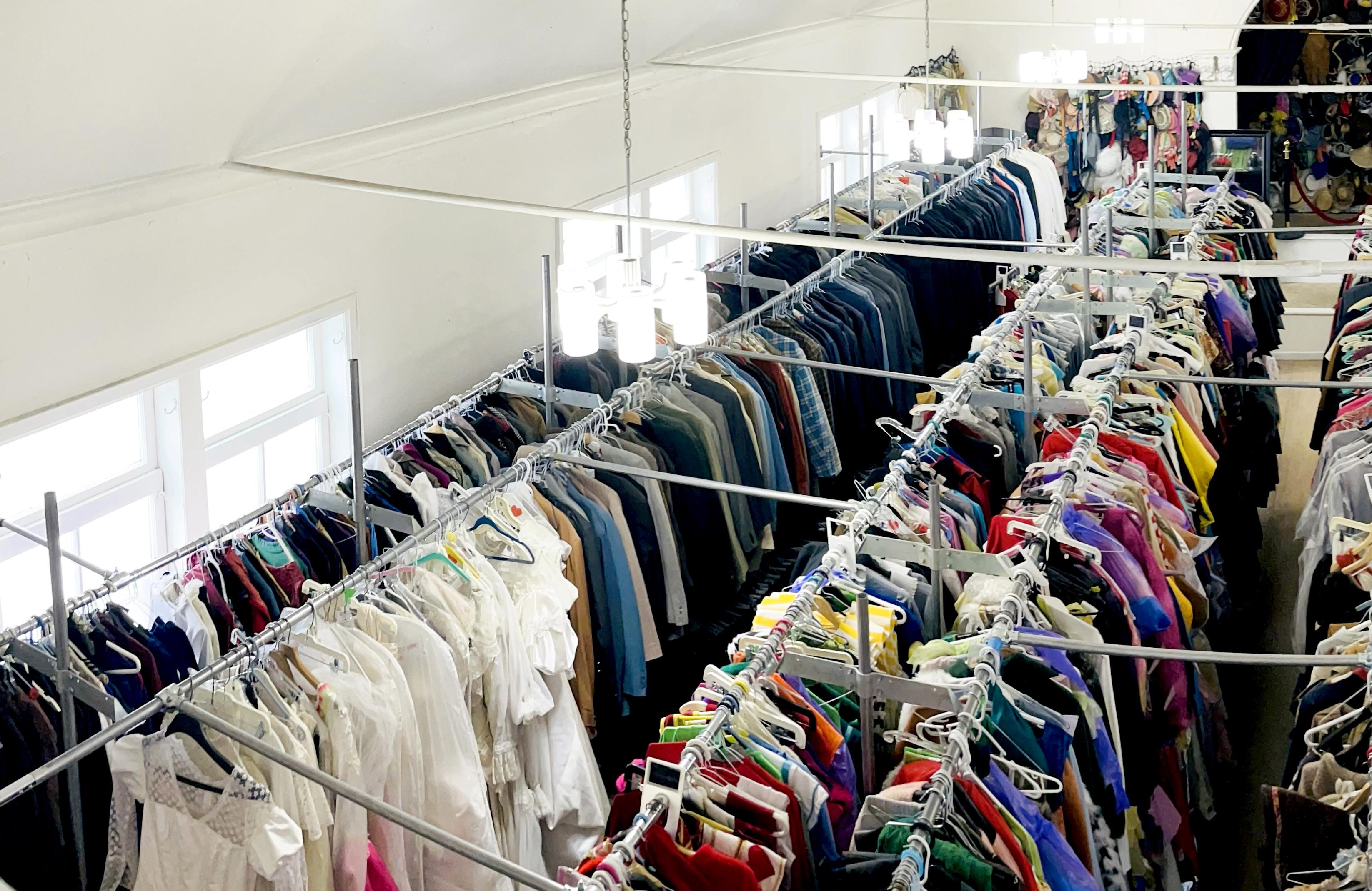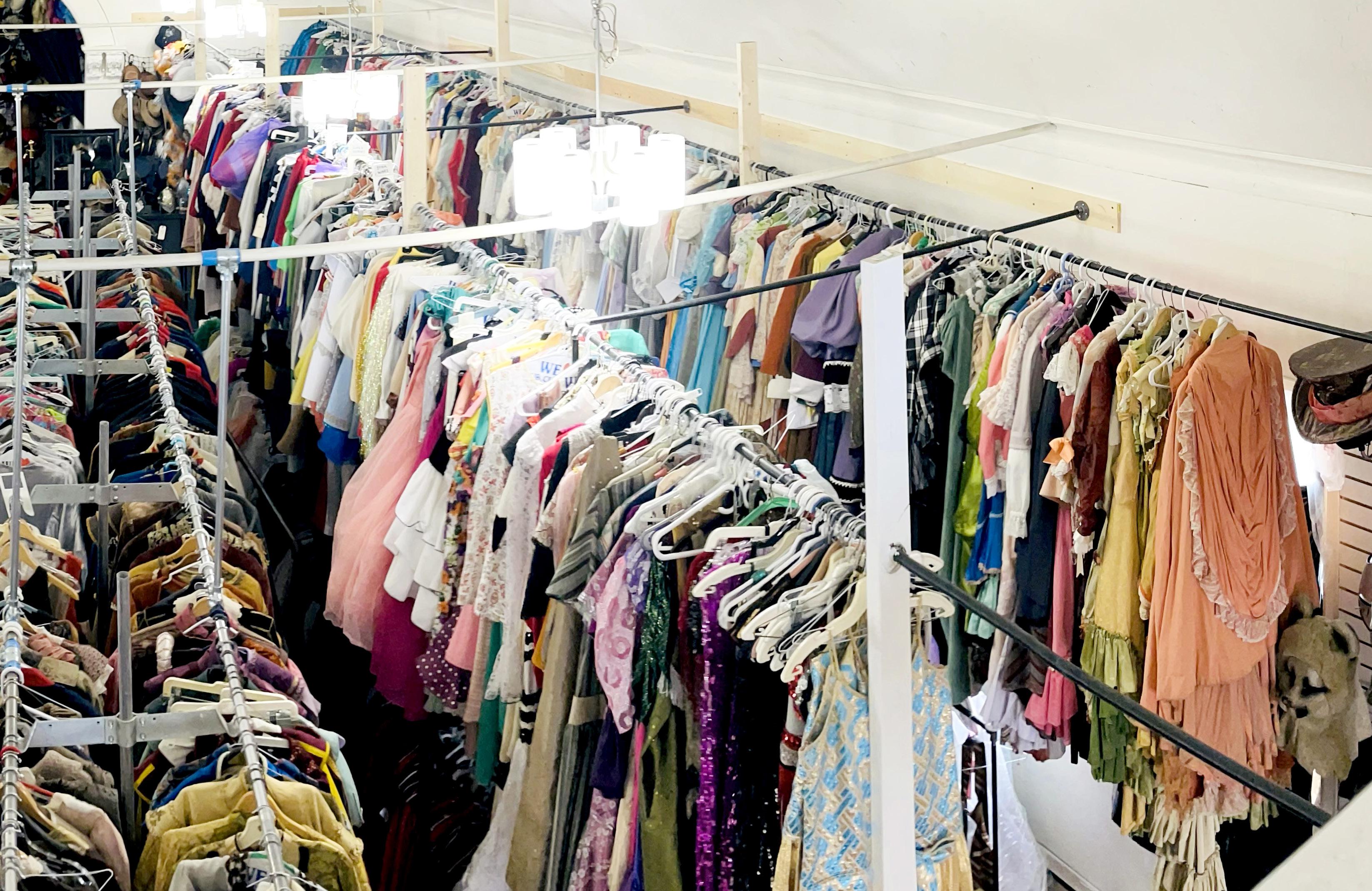 A wardrobe department resizes, repairs, steams and assembles costumes for pick up or shipment.