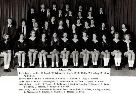 Class of 1974: Front row: Nettie (Jeanette) Ryan (Tully), Allan Armstrong, Ruth Dwinger (Kittson), Ian Crafter, Wim Lovell 2nd row: Stephen Tippett, Martin Belfield, Bar Robertson, Jennie Sparke, Robyn Wilson, Sally Adams, Mandy Rosser (Hornabrook), Caroline Macdonald, Carol Page (Hobson) 3rd row: Helen Berry, Bar Peters (Rowe), Sarah Ingram (Maconochie), Anne Maree Robson, Rex Hallyburton Back row: Jennifer Flynn (Riley), Lance Sparrow, Cec (Celia) Clarke (Dudley), Warren Wilmot, Richard Anderson, Chris Young, Jenny Beer (Murrie), Sarah Patterson At reunion but absent from photo:: Geoff Angell, Jo Bremner (Haddon), Chris Jolly, Rob Philip