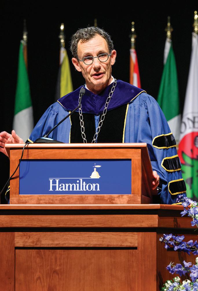 “So,” he continued, “lean into your power, your capacity to envision the future and systematically realize the vision, and you will tap into the full gift of the Hamilton experience. … With what you have experienced here at Hamilton, you have the power to show people a future more exciting than their past and inspire them to work together on the journey to a new world.”