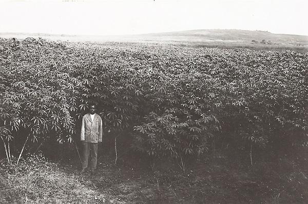 The photograph above culminates French attitudes towards both the Malagasy people and nature. Taken between 1930 and 1946, the image showcases a fully grown cassava field with one black individual, most likely the worker responsible for the yield. As one can observe, the yield is large. Like the indigenous people photographed at the baobab or the children with the coffee bushes, the man shown above demonstrates scale to understand the depth of the cassava yield. Not only is this an economic demonstration of agricultural wealth, but it is also a shrinking of the man present. The title of the photograph, Plantation de manioc, reinforces that the subject is the plantation, not the man. Furthermore, the man stands just outside the plantation as if emerged from within it. The upper third of the frame gives the image depth, documenting how vast the cassava is as well as the hills beyond. In the photograph above, the black laborer is a part of the landscape and not his own being.