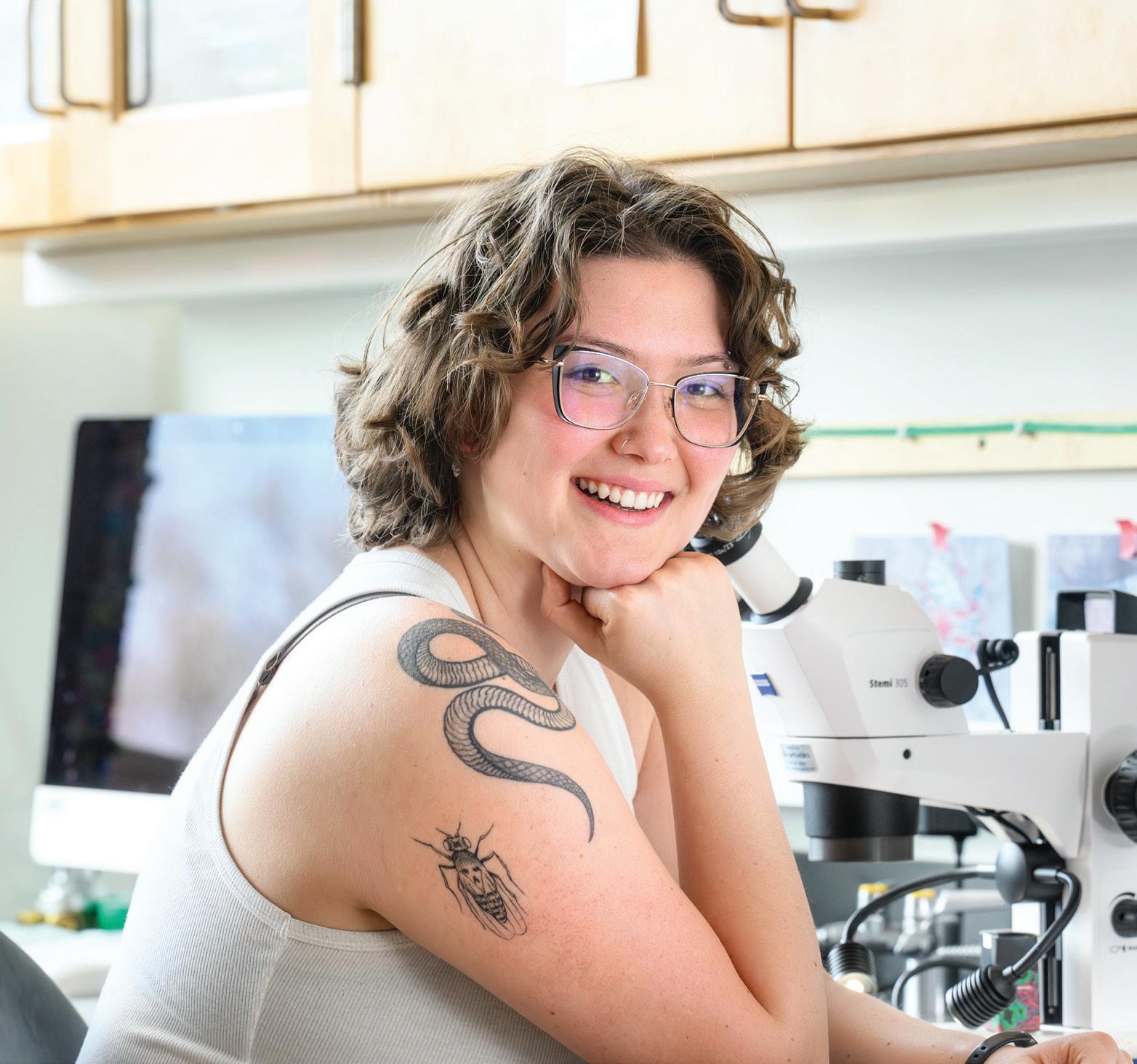 Days, evenings, or weekends, Abigail Lowder ’25 could often be found in the lab caring for her test subjects, Drosophila melanogaster — the common fruit fly. A neuroscience major and American studies minor from Putnam Valley, N.Y., she has worked with hundreds of the tiny creatures, analyzing their brains to understand what might go wrong and lead to cancer.