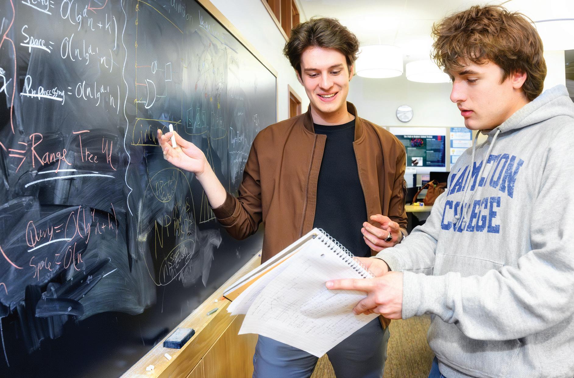 NOW: Putting their special Hagoromo chalk and computer science skills to use, Colledge, (left) and Michael Stewart ’25 work out a coding problem in Christian A. Johnson Hall.