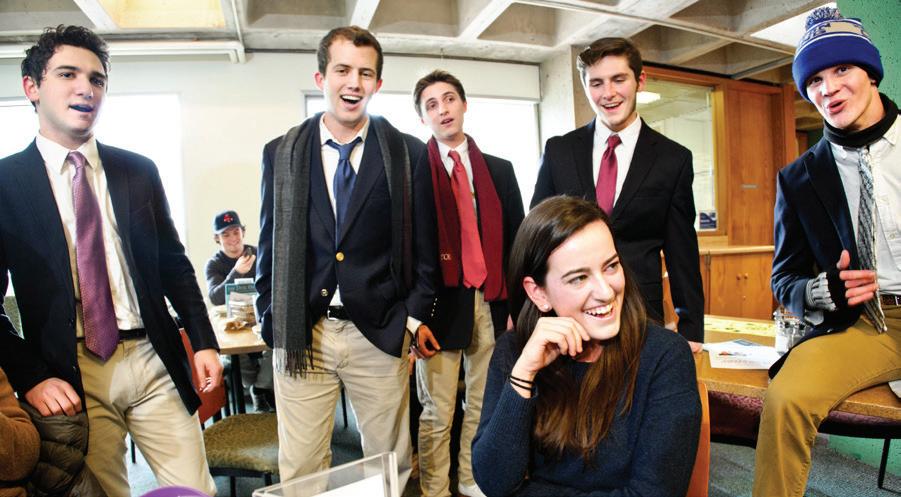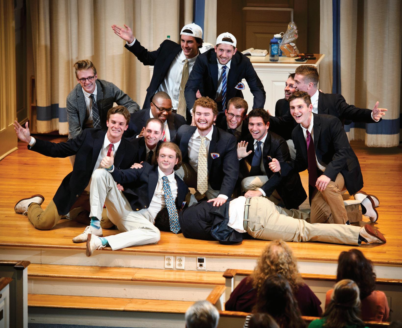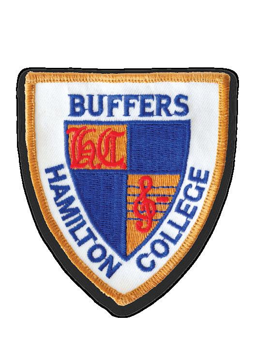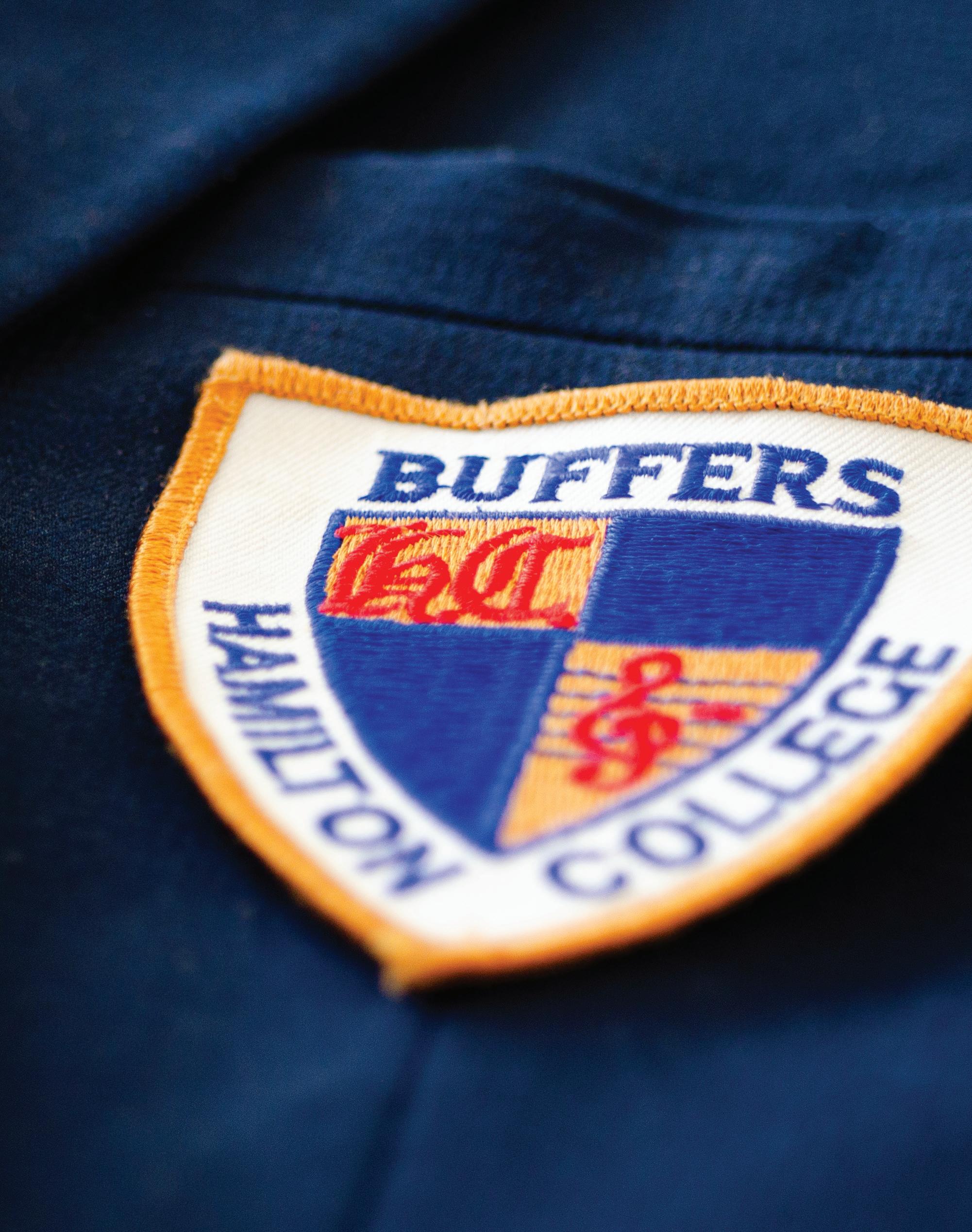 THIS PAGE: The traditional attire of a Buffer includes a navy blazer featuring the official emblem. Hamilton’s oldest a cappella group is marking its 75th anniversary. PAGE 46