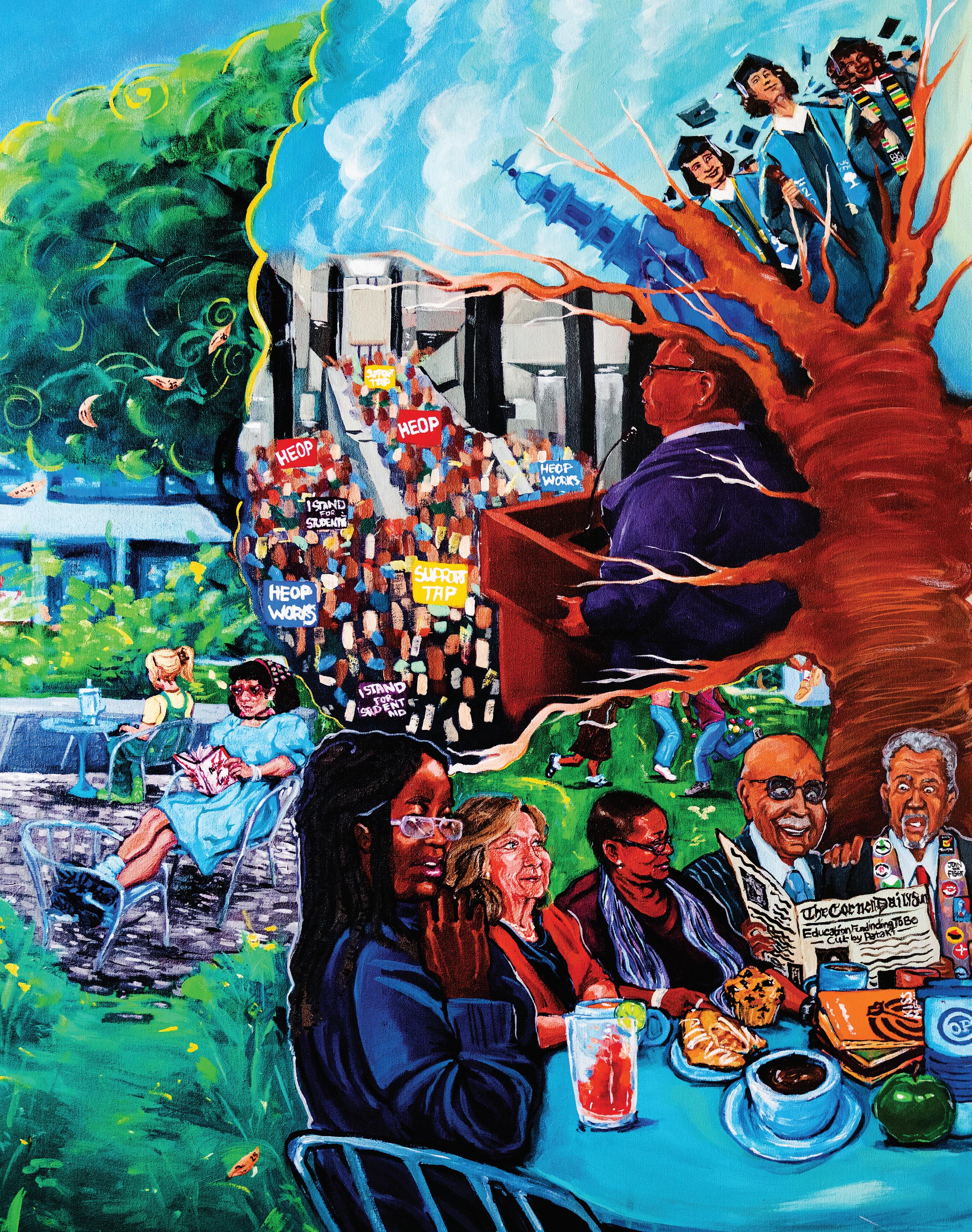 This 4- by 7-foot work of art, created by Nat St. Helen ’27, features some of the events, people, buildings, and symbols that celebrate the history of Hamilton’s Opportunity Program, which began in 1969 with the Higher Education Opportunity Program (HEOP).