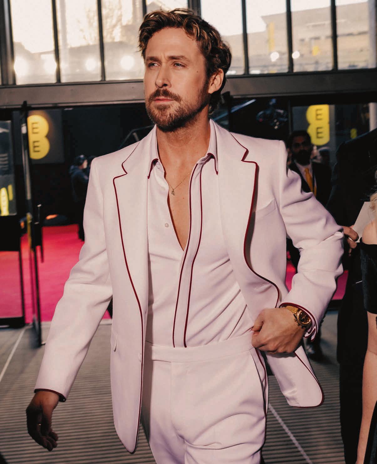 At right: At the 2024 BAFTA Awards, Gosling (opposite page) walked the red carpet in a custom, single-breasted piped-wool Gucci suit and also turned heads with his one-of-a-kind TAG Heuer Carrera Chronograph timepiece in yellow-gold with a Milanese mesh bracelet.