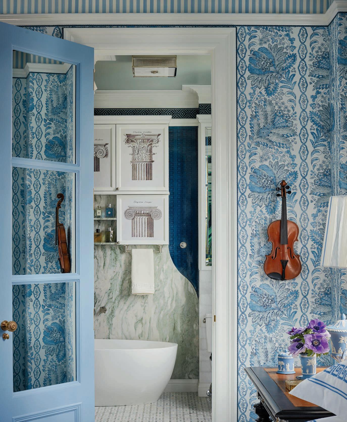 This page: For the primary bedroom, Watson designed the bedspread, the linens, and the bed, with its canopy of 92 pleats. “My grandmother’s late 1600s Persian doors contrast wonderfully with the enveloping and comprehensive blue toile,” he says.