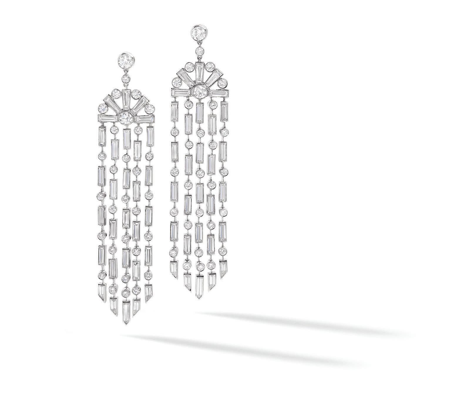 At right, the Hamilton Jewelers Private Reserve chandelier earrings and necklace in platinum with bezel-set diamonds raise the bar on her night-on-the-town little black dress.
