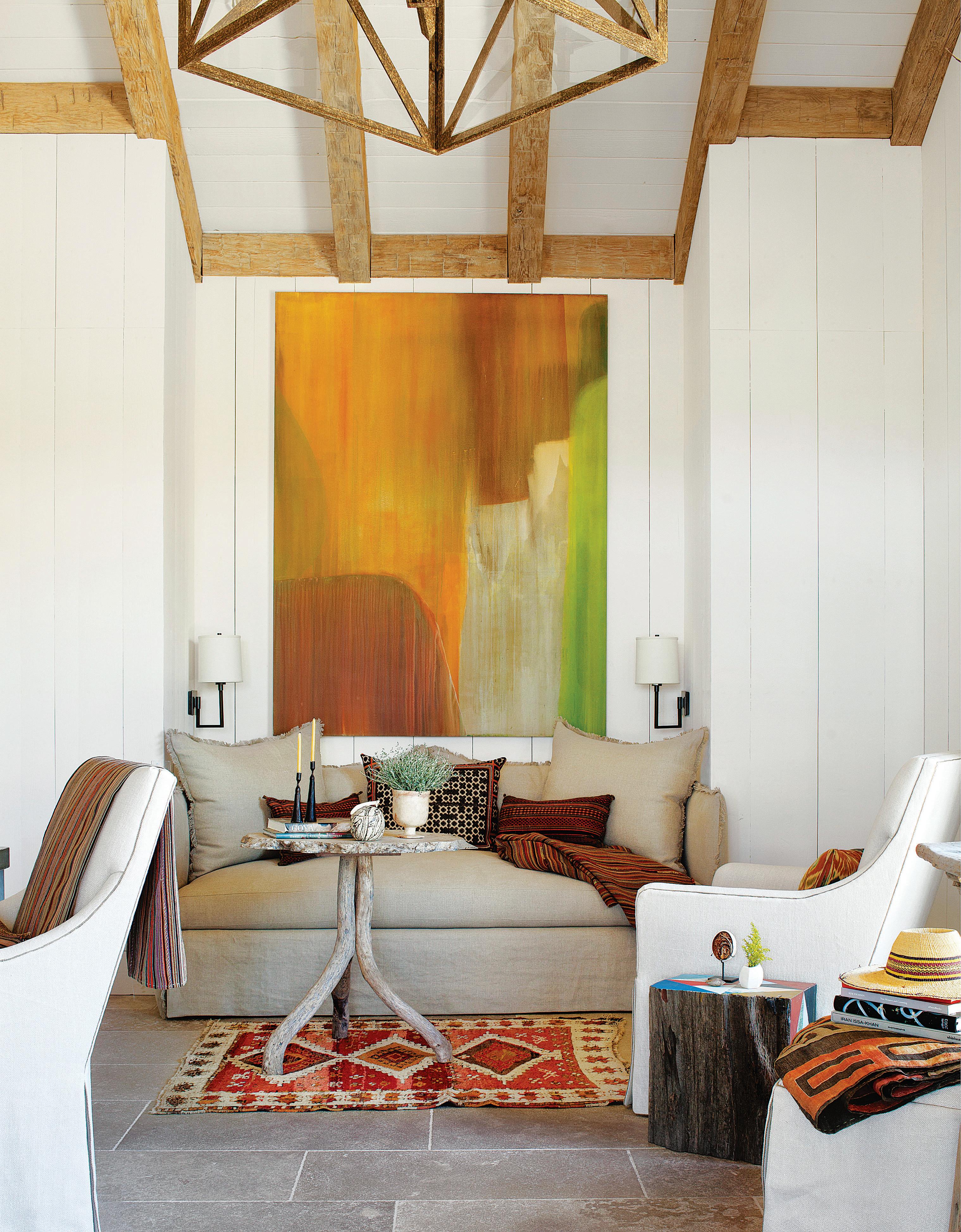 This page: To make the new home fit in with the rustic surroundings, elements such as shutters, siding and a corrugated metal roof were deliberately weathered. Salvaged rafters provide support and visual allure for the high ceiling, while a mix of materials—stone, wood, cowhide—in neutral tones provides texture to the space. Opposite page: Chairs with fine leather upholstery as well as a wall sculpture by Merja Winqvist offer more texture in the dining area.