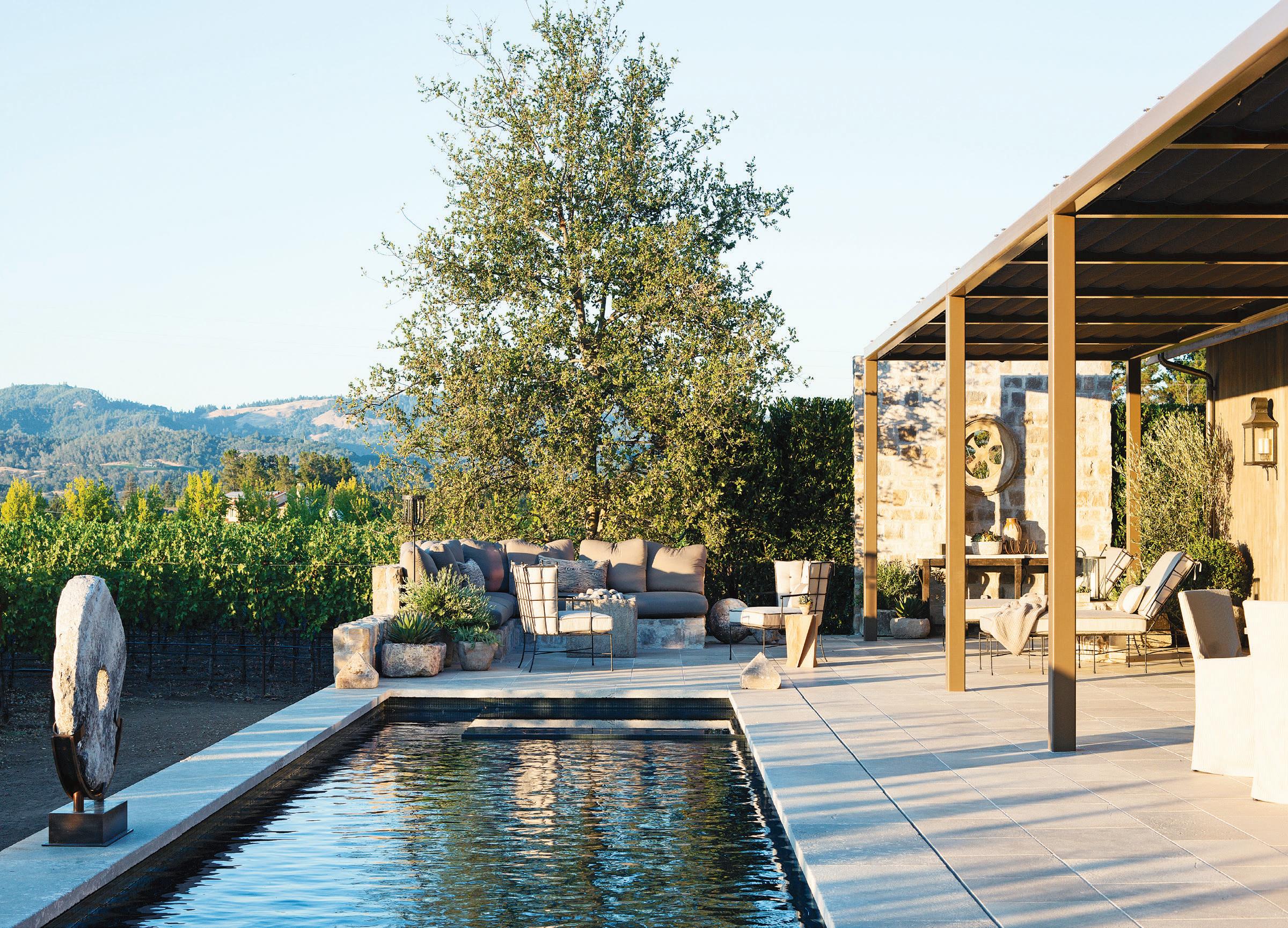 This page: A built-in stone banquette runs along the edge of the pool deck, which leads directly into the adjacent vineyards. The stone sculpture on a metal stand is a salvaged millstone, and the hammered steel patio furniture is part of a line created by Hallberg. Opposite page: In the wife’s studio, a sitting nook is decorated with ethnic textiles and a salvaged coffee table.
