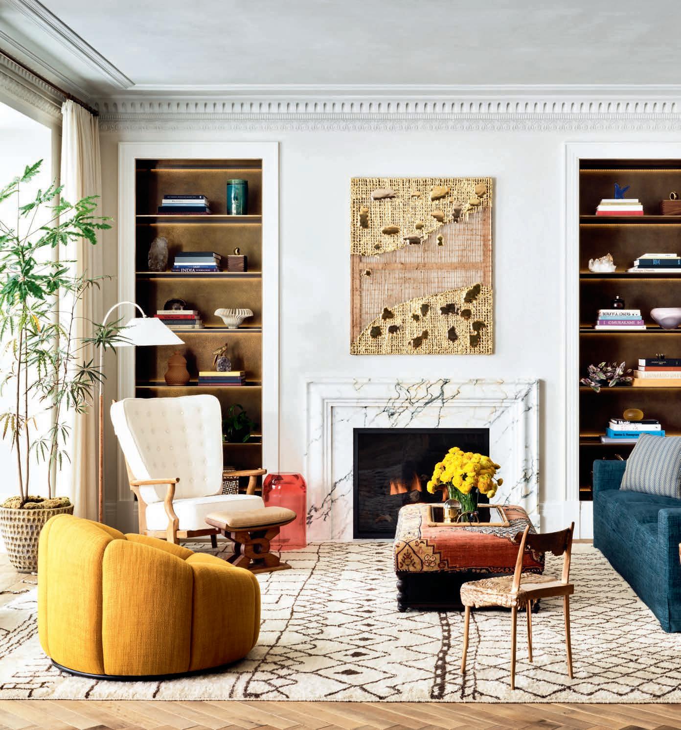 At left: Designer Nicole Hollis combines vintage pieces with artisan furnishings to recreate a home in San Francisco’s Haight-Ashbury district. Comfortable seating in the living room includes vintage lounge chairs by Guillerme et Chambron and Pierre Paulin, a sofa by India Mahdavi and Les Lalanne’s “Crocoseat.” On the walls are Nancy Lorenz’s Landscape Poem and a “Looker T. Washington” mirror by the Haas Brothers.