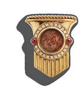 In my role at H1912, I make efforts to translate for clients the artistic qualities of the rare and coveted jewels of a bygone era. Although this piece was made in the 1980s, this exquisite vintage 18k yellow gold Roman coin brooch featuring 22 round brilliant diamonds and two cabochon rubies has an extraordinary history: the featured coin is of Roman emperor Constantine the Great, from 307-337 A.D.”